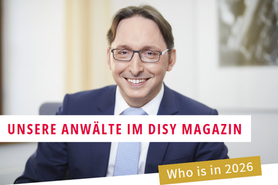 Das DISY Magazin hat mehrere Anwälte unserer Kanzlei für die Rubrik „Who is in 2026“ interviewt. Die Interviews zeigen unterschiedliche Perspektiven auf den Anwaltsberuf – von persönlicher Motivation und beruflicher Prägung über Spezialisierung und Digitalisierung bis hin zur Frage, was anwaltlichen Erfolg heute ausmacht. Deutlich wird dabei: Der Beruf ist so vielfältig wie die Menschen, die ihn ...