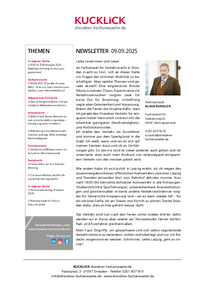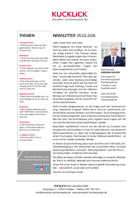Unser Newsletter aus der Welt des Rechts erscheint monatlich und informiert Sie über aktuelle juristische Entscheidungen und Neuigkeiten aus unserer Kanzlei. Möchten Sie stets den neuesten Newsletter erhalten, dann melden Sie sich gern zu unserem Newsletter-Service an.